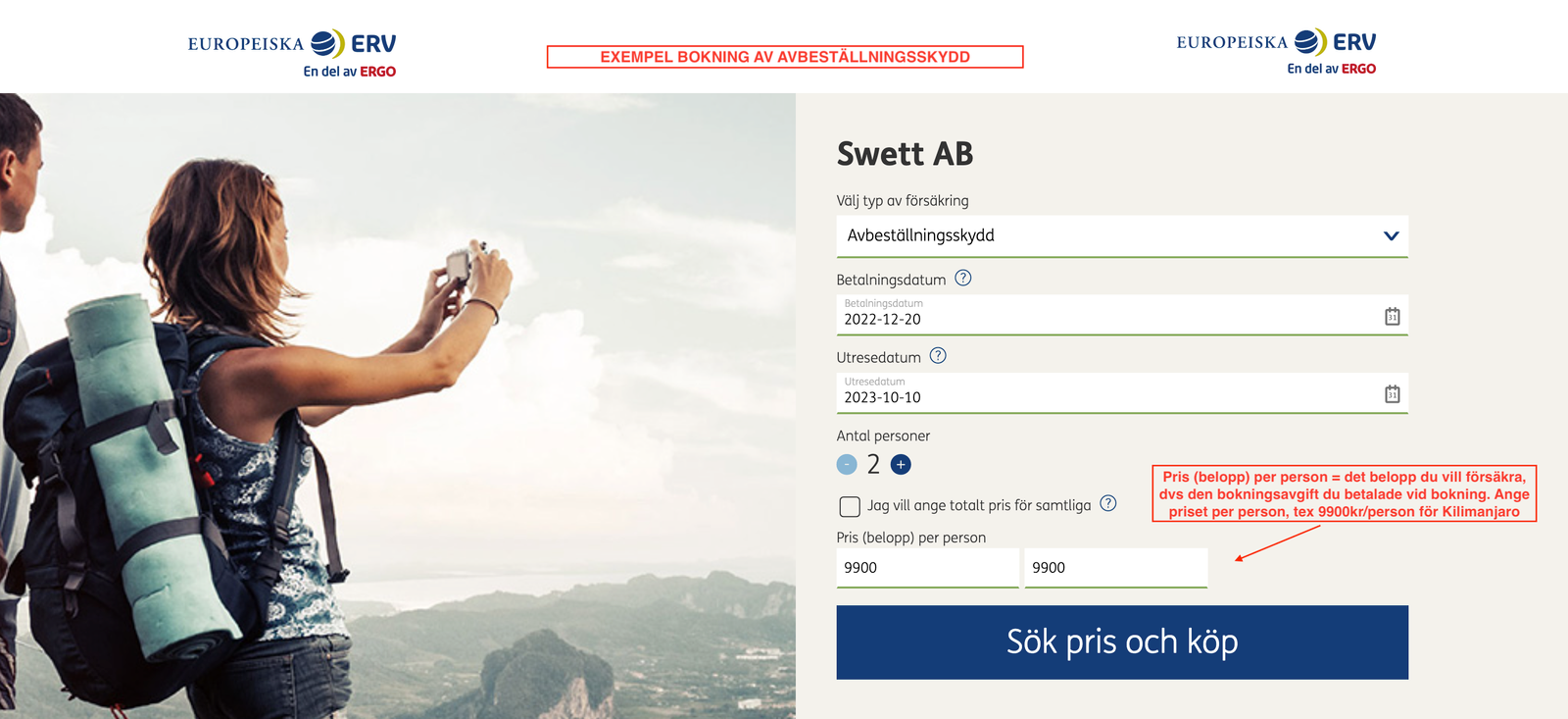 7. Under ”Pris (belopp per person)” anger du beloppet du vill försäkra (endast bokningsavgiften eller hela resans pris)