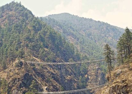 Vi följer vägen längs Dudh Koshi-floden och förbi stora skogsområden fulla av barr- och rhododendronträd tills vi kommer till en by med namnet Monjo. Här stannar vi och äter en god lunch. Efter lunchen fortsätter vi över en bro, korsar en tallskog och vandrar längs en brant led upp till Namche Bazaar, sherpornas huvudstad och “porten till Mount Everest”. Det är ett myller av folk, små affärer och hotell. Här vilar vi upp oss i en fin lodge och njuter av att ha genomfört de två första dagarna med bravur.